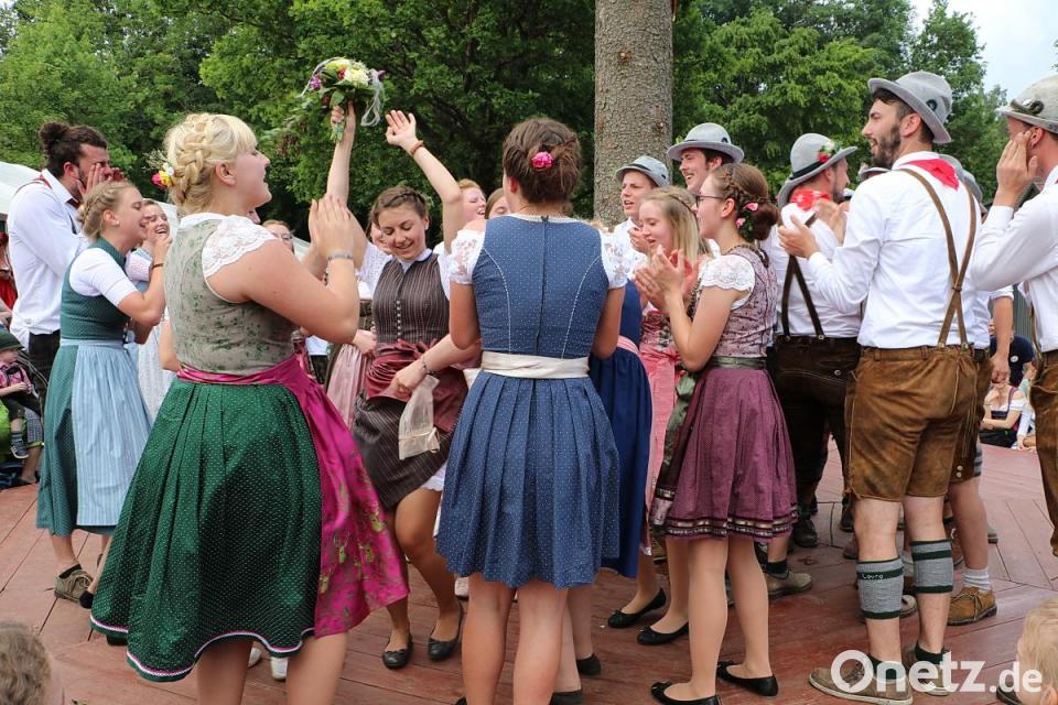 Nach dem Mittagessen wurden im Dorf die Moila eingeholt und mit Musik auf dem Oldtimerbulldog zum Festplatz chauffiert. Viele Besucher umringten inzwischen den Tanzboden und feuerten die Kirwa-Paare bei ihren bestens eingeübten Tänzen und Liedern an. Musikalische Begleitung waren die "Höidlbrummer".