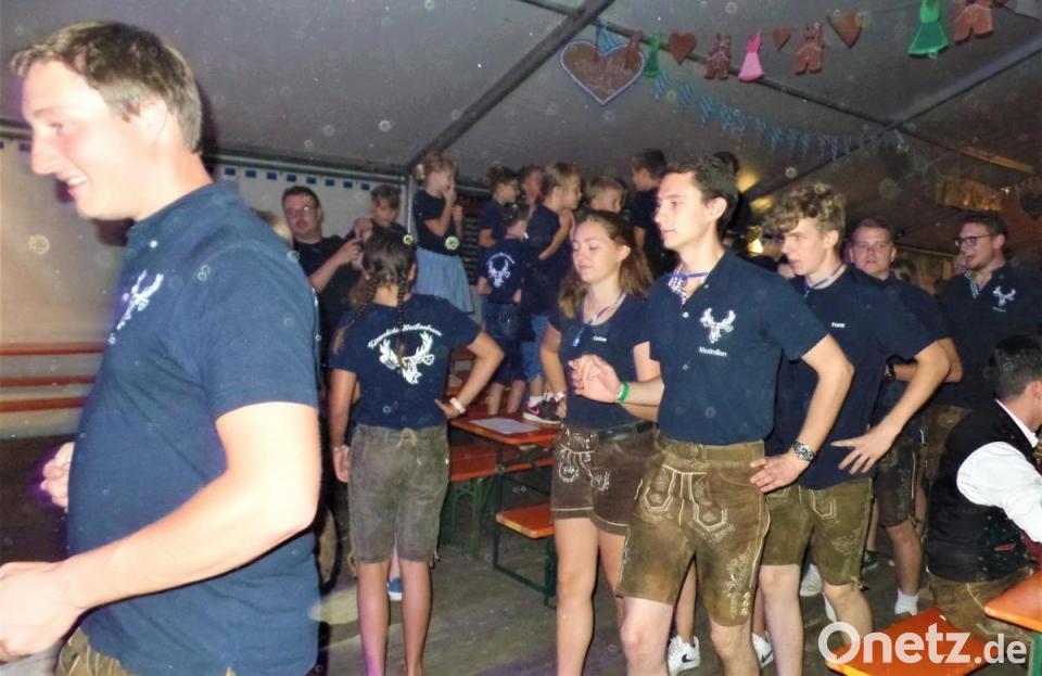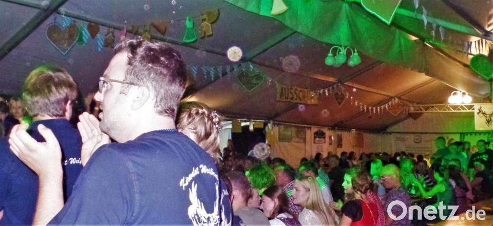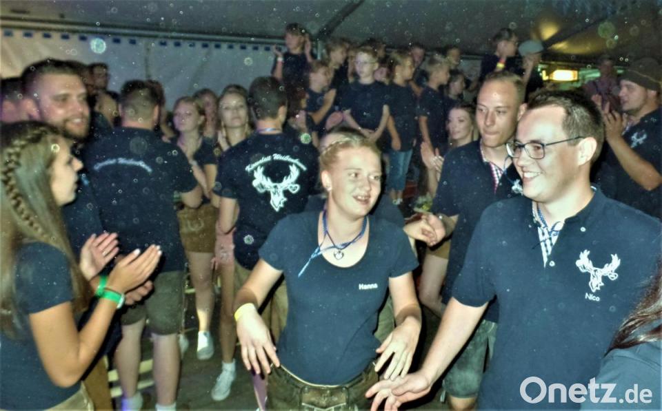 Viele Besucher waren erst noch draußen in der warmen Abendsonne und am Imbiss-Stand warteten lange Schlangen auf Unterlagen für Süffiges. Dunkelblaue T-Shirts mit dem markanten Hirschgeweih der Weißenbrunner Kirwaleit auf dem Rücken waren dabei die Blickfänger. Auch die zwanzig Gäste aus Weißenbrunn in Oberfranken hatten sich farblich perfekt angepasst. Mit ihnen hatten die Vorstände der Oberpfälzer vorher eine Panoramawanderung im und um den Ort unternommen. "Damit die auch mal sehen, wie wir denn so wohnen", informierte Benjamin Hagler schmunzelnd.