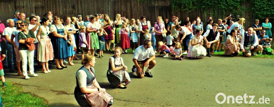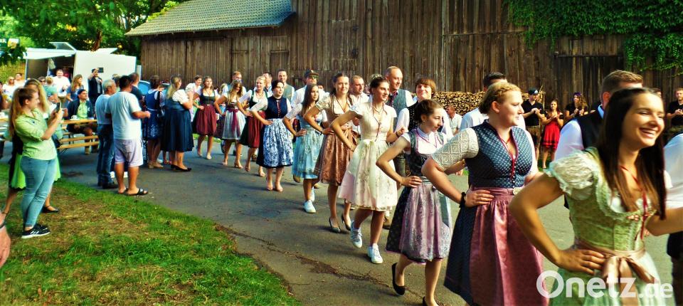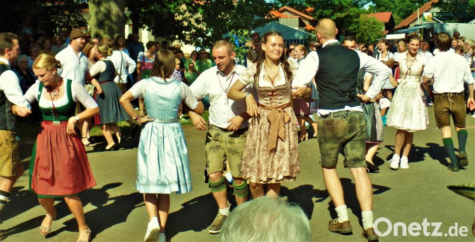 Am Kirwa-Sonntag konnten die Besucher nicht nur die warme Herbstsonne genießen, auch kulinarisch war einiges geboten. Vom Süßwarenstand dufteten frisch gebrannte Mandeln, gegrillte Makrelen lockten mit deftigem Aroma. Goldgelb lockte an der Theke der Schmierkuchen mit seinen Rosinenaugen neben frisch gezuckerten Kirwakücheln und vielen Torten für jeden Geschmack. Alle selbst gebacken von den Gründörferer Frauen. Kleine Gäste tobten den ganzen Tag auf der Hüpfburg. Das Trio "Geschwister Baier" aus Wittschau schaffte es auch komplett ohne Elektronik, mit ihrem Sound Tänzer und Besucher in gute Laune zu versetzen. Vor allem die Tanzpaare um den kleinen Kirwabaum, die ihr Oberkirwapaar austanzten. Fünf Kinderpaare und zwölf Erwachsenen-Pärchen zeigten, was sie in sechs Wochen unter der Anleitung von Lena Forster aus Hannersgrün eingeübt hatten. Die Mädchen und jungen Damen in Dirndlkleidern, die Buben und Burschen in Lederhosen begeisterten mehrere hundert Zuschauer bis einer der beiden herumgereichten Blumensträuße dann beim "richtigen" Oberkirwapaar landete.