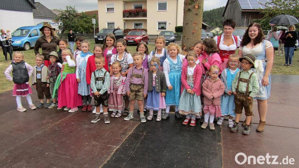 Im Dorfzentrum trafen sich derweil die kleinen Tänzer für die Generalprobe ihrer Aufführungen zum Kirwaaustanzen. Während der Ferien hatten sie schon am KLJB-Ferienprogramm teilgenommen und an vier Nachmittagen mit Lena Steger und Hanna Baumann fleißig Kirwatänze geübt. Jetzt hatten sie ihre Premiere.