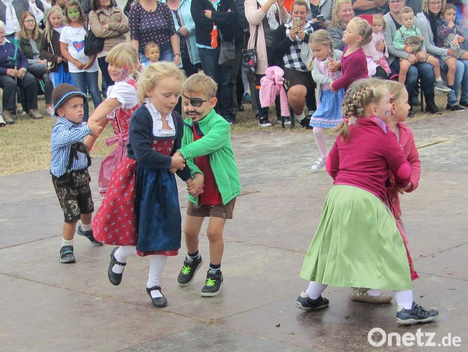 Gut eingeübt hatten Lena Steger und Lena Vogl von der KLJB die Kirwatänze mit 16 Kindern. Fünf Probennachmittage übten sie in ihrem Ferienprogramm. Da stand genauso viel Eifer dahinter wie bei den Großen, die am Abend bei strömendem Regen auf dem Hänger eines Traktor vorfuhren. 20 Paare zogen auf den Festplatz ein, angeführt von den Gseesa Wepsn aus Kleingesees. Die Band spielte zum Austanzen und unterhielt später die Gäste mit Musik. Gstanzln und zünftigen Kirwasprüchen.