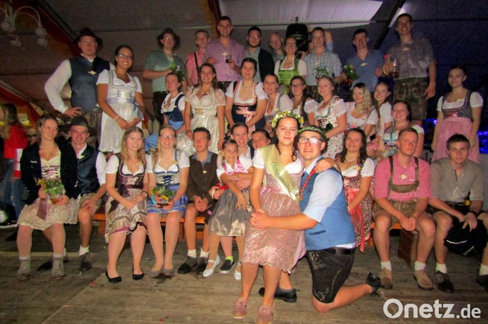 Der Wecker hatte offensichtlich Mitleid mit den Kirwamoidln und ihren vom Regen durchnässten Dirndln. Es dauerte nur etwa eine Viertelstunde, bis er schellte und die Gratulanten das Oberkirwapaar Corinna Kraus und Florian Geyer hochleben ließen. Als Insignien hingen für sie eine Schärpe sowie für ihn Hut und Kuhglocke am Baum. Damit ausgestattet, drehten sie den Ehrentanz und warfen anschließend Brezelstücke, Würste und Bonbons in die Menge.