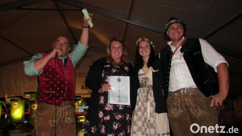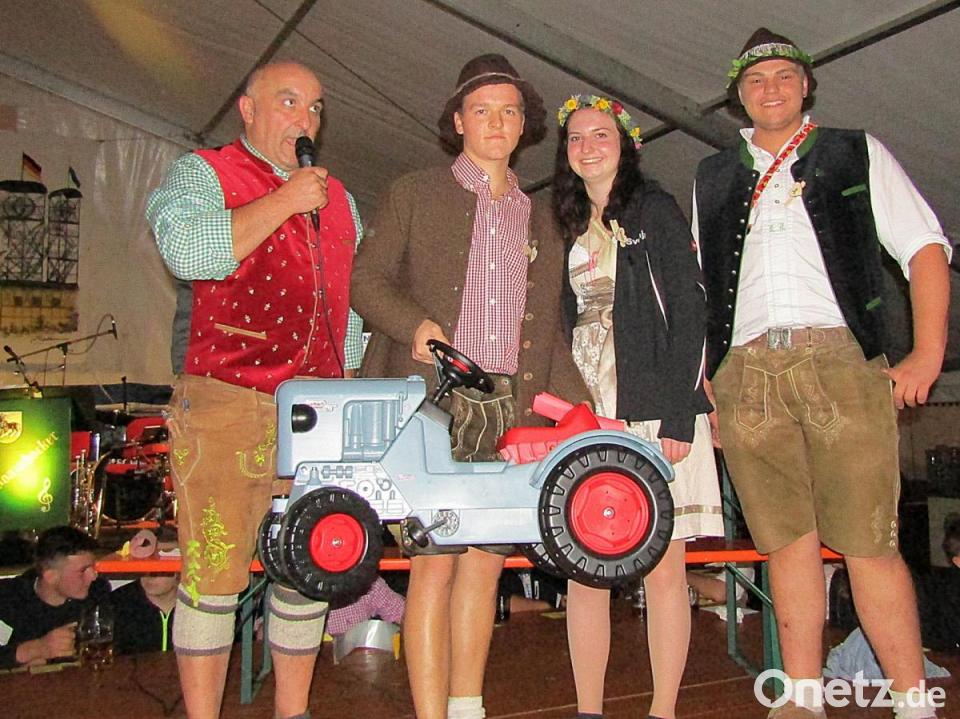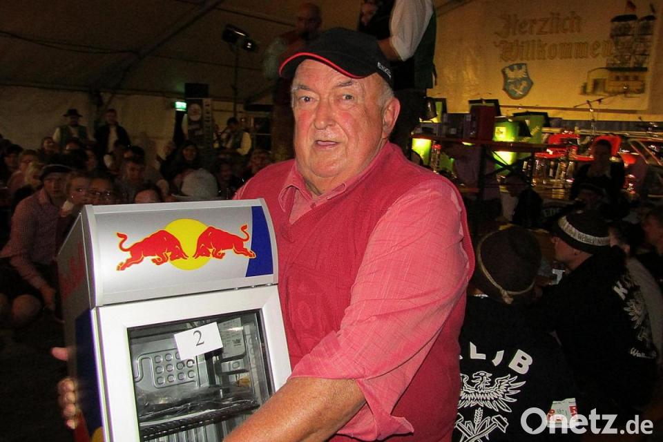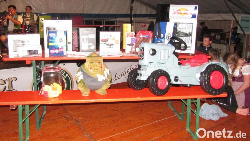 Konstantin Karl sahnte gleich drei Mal ab, unter anderem den Tretbulldog. Andreas Trenz gewann die Kaffeemaschine, und „der Schmieh“ Gerhard Waldmann freute sich über den Party-Kühlschrank. Auch die Kirwmoidla waren erfolgreich. Eva-Maria Schübel bekam fünf Liter Sägekettenöl und Marina Ehras einen Radiowecker. Den Kirwabaum aber ging an Sabrina Leipold.
