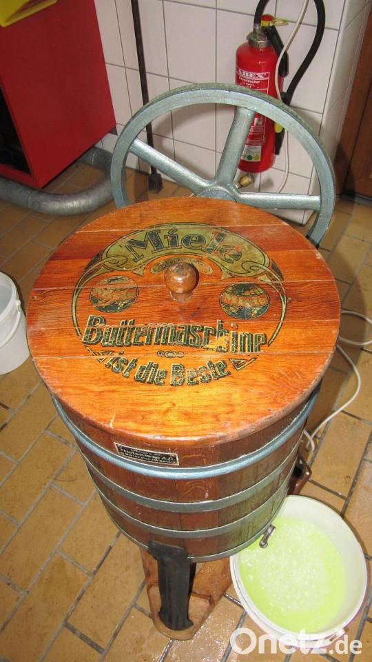 Insgesamt zwölf Eimer der Rohstoffs mit 40 Prozent Fettgehalt verarbeiteten sie. Für diesen Zweck brachte Karin Kugler wieder ihre Original-Buttermaschine der Miele-Werke in Gütersloh/Westfalen mit. Das gute Stück ist nach wie vor voll funktionsfähig, auch wenn es schon mit dem dritten Motor läuft. Sepp Schindler hat ihn eingebaut. So muss der Rahm nicht mehr, wie vor 1900, mit einer Handkurbel zu Butter gerührt.