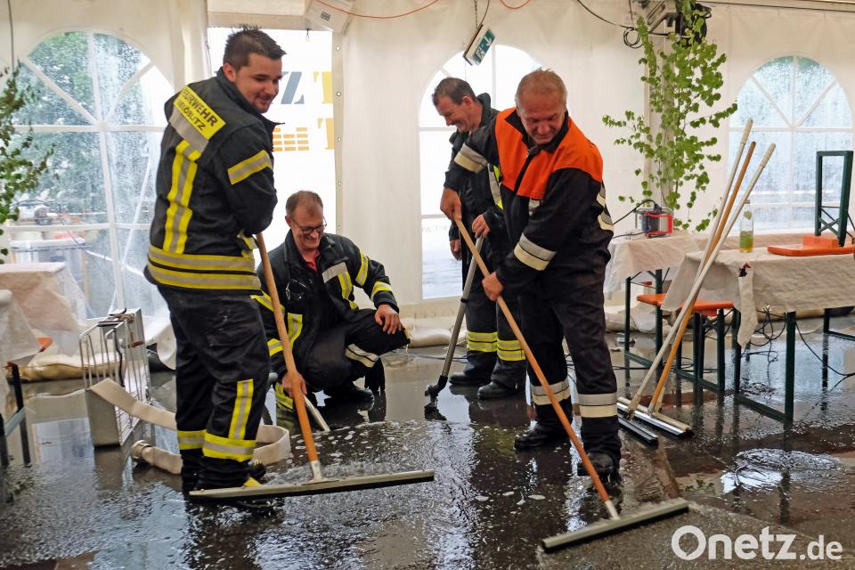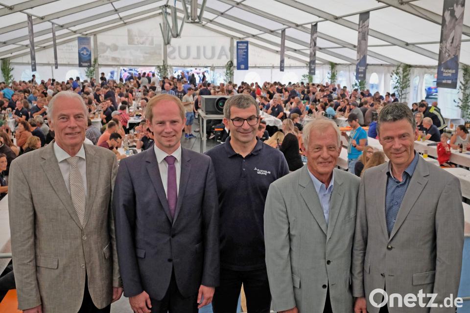 Doch zu Beginn des Festes ging ein Wolkenbruch nieder und setzte den vorderen Teil des Zeltes unter Wasser. Das tat der Stimmung keinen Abbruch, denn die Werks- und die Oberköblitzer Feuerwehr saugten das Wasser ab, legten Sandsäcke ums Zelt und Paletten in den Eingang. So begann die offizielle Eröffnung und Begrüßung der rund 1400 Gäste durch den Geschäftsführer der Flachglas Wernberg, Robert Meier, eine Stunde später. Meier freute sich, dass das älteste ehemalige Mitarbeiter, der 95-jährige Albert Völkl, der 1941 ins Unternehmen eintrat, gekommen war. Ebenso hieß er Richard Thaller, der als Betriebsrat maßgeblich 1999 am Umbau zum Mitarbeiterbeteiligungsmodell beteiligt war, sowie den Aufsichtsrat der Flachglas Wernberg GmbH mit dem Vorsitzenden Dr. Hans Nuißl, stellvertretenden Landrat Arnold Kimmerl und Bürgermeister Konrad Kiener willkommen.