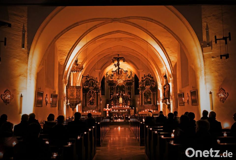Die Seitentür war absichtlich versperrt und so mussten alle Besucher die Kirche St. Anna durch das hintere Hauptportal betreten. Es bot sich ihnen ein überwältigender Anblick. Der gesamte ältere Bereich der Kirche und der Altarraum waren mit unzähligen flackernden Kerzen geschmückt. Verstärkt durch elektrische Strahler, die von unten die schönen gotischen Gewölbestreben beleuchteten, entstand ein bezauberndes und anheimelndes Bild des ohnehin schönen Raums. Unterstützt wurde die stimmungsvolle Atmosphäre noch durch die Stille im Gotteshaus. So füllte sich auch nur der hintere Teil der Sitzreihen und ließ den Blick frei für die schönen Lichteffekte.