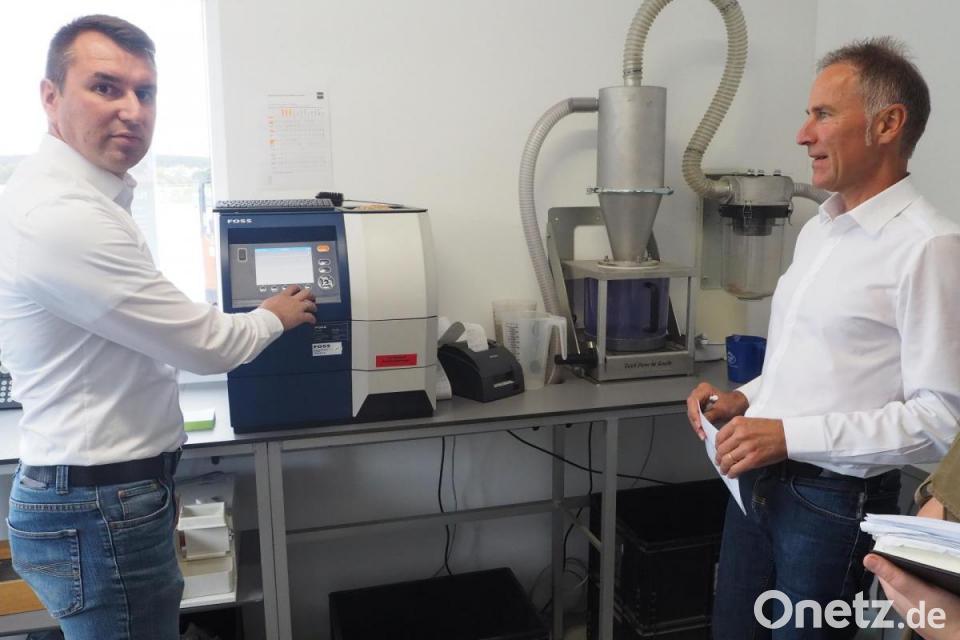 Wer auf dem 7000 Quadratmeter großen Gelände in der Ulrich-Hübner-Straße 4 mit seiner Ladung Feldfrüchte ankommt, muss mit seinem Gespann zuerst auf die Waage. So wird ganz schnell das Gewicht der Ware ermittelt - als Differenz zu den Kilos nach dem Abladen. Vom Büro aus lässt sich außerdem die Probe-Entnahme mit einem kleinen Kran steuern. Weizen oder Raps landen dann ganz schnell in einem Mixer, der die Qualität ermittelt. "Das bedeutet auch weniger Risiko, weil keine mehr auf einen Wagen klettern muss ", erläutert Rauschert. Wie viel Kleber oder Protein beispielsweise im Getreide steckt, entscheidet aber auch über den weiteren Absatzweg und den Preis. Manche Lieferung eignet sich vielleicht nur für Futter, während die nächste für Mehl taugt, aus dem Brot gebacken wird.