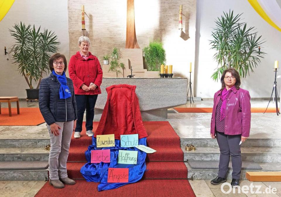 Im darauf folgenden Besinnungsteil ging Maria Krös auf die Farbigkeit des Lebens ein. Diese wurde durch farbige Karten mit den Aufschriften Schutz, Liebe, Zuwendung, Hoffnung und Ängste, ergänzt mit Zuversicht, zum Mantel dekoriert. In der abschließenden Segensbitte wurden die Gottesdienstbesucher mit dem Anliegen verabschiedet, dass sie gehen mögen zu den Menschen, für die sie verantwortlich sind und die sie brauchen.