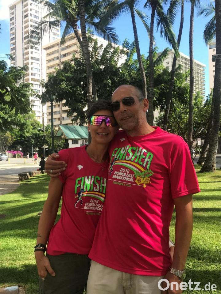 Stefan Falter und seine Ehefrau Daniela fallen sich glücklich in die Arme. Sie sind nach 42,196 Kilometern ins Ziel gekommen, erhalten die Medaille aus Muscheln und das begehrte Finisher-Shirt. Die erfolgreichen Läufer im roten Outfit werden in Honolulu auf der Straße von wildfremden Menschen angesprochen. Sie gratulieren. "Keiner hat uns nach der Zeit gefragt", fällt Stefan Falter auf. Es zählt die Beharrlichkeit, die Ausdauer, um ein Ziel zu erreichen.