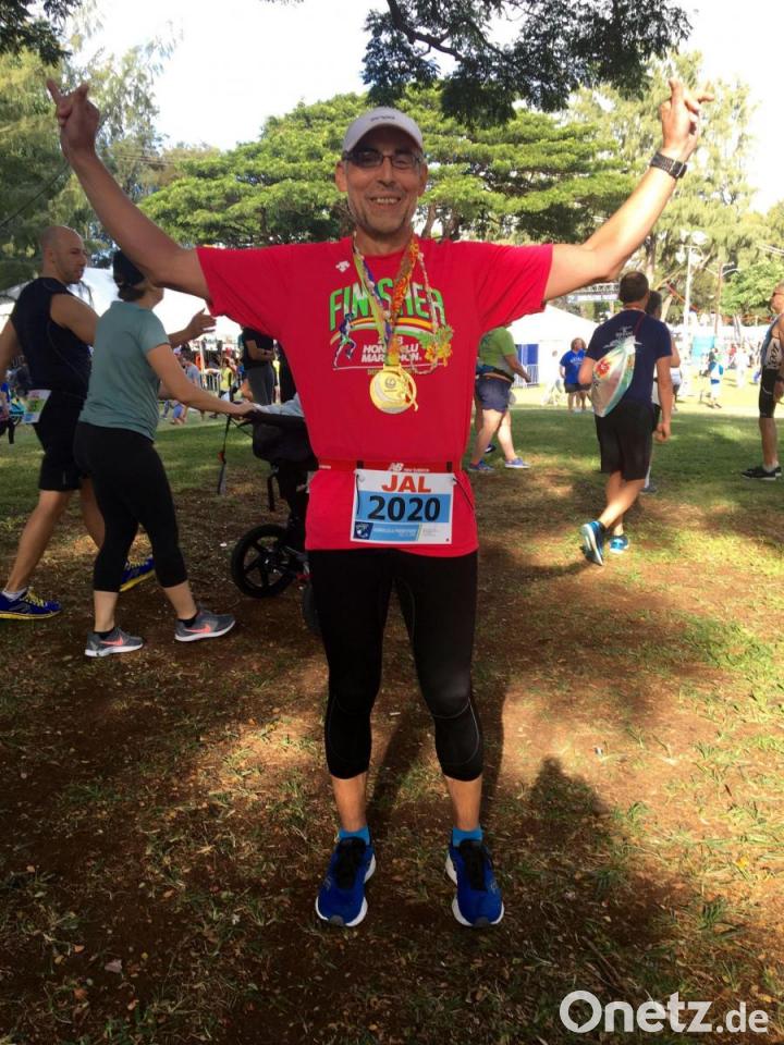 In Honolulu fiel der Startschuss - nach einem großartigen Feuerwerk - aufgrund der Hitze schon um 5 Uhr morgens. Die Strecke wurde zur Herausforderung: "In Deutschland hätte man den Lauf wegen Sturm abgesagt. Ich habe vorher noch bei keinem Lauf mein Käppi festhalten müssen", beschreibt Falter den extremen Gegenwind. Doch dann lag das Ziel vor ihm: Im Kapiolani-Park am weltberühmten Waikiki-Beach - und da war alle Anstrengung vergessen.