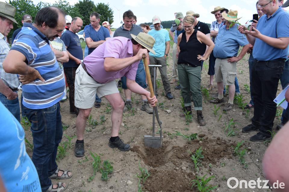 Die Bodenproben wurden von einem Maisfeld von Josef Hägler entnommen, der sich seit Jahren dem humusaufbauenden Wirtschaften mit Erfolg verschrieben hat. Über 700 Landwirte informieren sich jährlich bei dem erfahrenen Landwirt über seine etwas andere Art der Bodenbewirtschaftung. Mit Hilfe der Spatendiagnose kann das Gefüge des Bodens aufgezeigt werden. Nach einer genau festgelegten Vorgehensweise wird aus dem Boden ein sogenannter "Bodenziegel" entnommen und entsprechend der Gefügebonitur klassifiziert. Dabei wird zwischen lehmigen, tonigen oder sandigen Böden unterschieden.