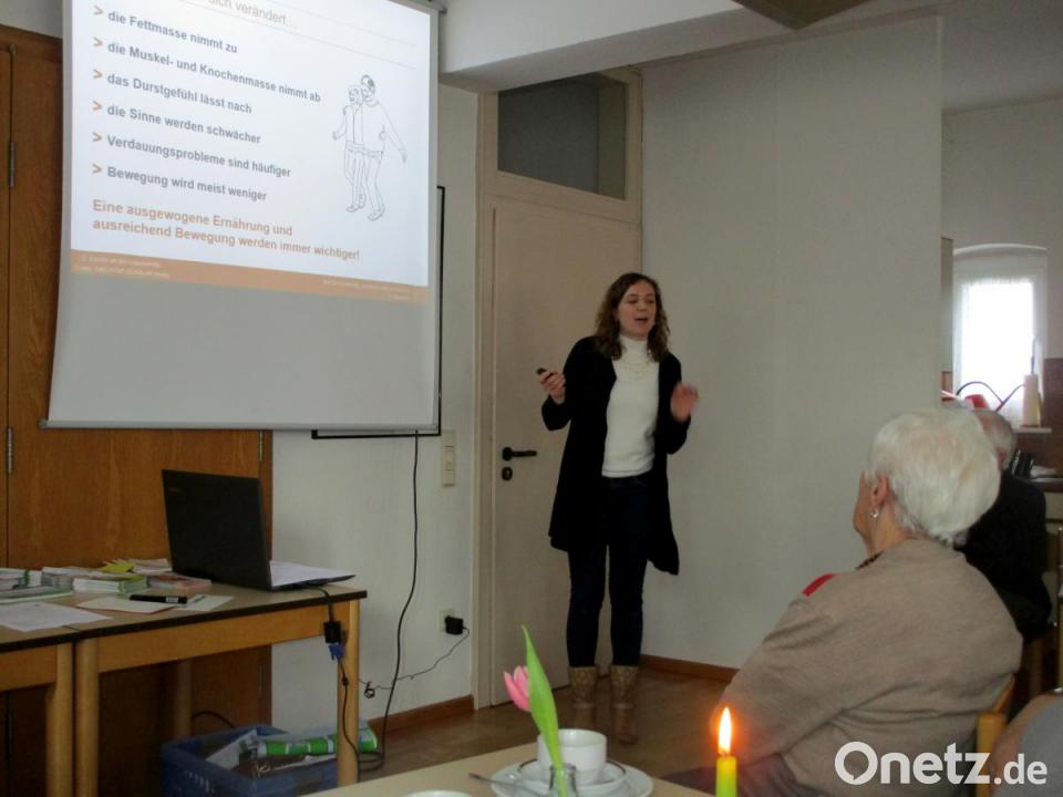 Zum besseren Verständnis konnten sich die zahlreichen Teilnehmer an einer Ernährungspyramide orientieren. So sei es wichtig, bewusst sechsmal täglich ein Getränk zu sich zu nehmen. Über den Tag verteilt sollten 1,5 Liter getrunken werden. Außerdem sollte man möglichst fünfmal täglich Obst und Gemüse (zwei Teile Obst und drei Teile Gemüse) zu sich nehmen. Christina Apel riet: "Essen Sie mehr Vollkornprodukte und Milchprodukte für den Kalziumaufbau. Natürlich darf auch die Bewegung nicht fehlen." Anhand von vielen Beispielen zeigte sie, wie leicht und vielfältig es sei, sich an die Verzehrempfehlung zu halten. Die Teilnehmer nahmen durch Fragen und kurze Diskussionen regen Anteil und es wurde allen verständlich, dass mit einer bunten Vielfalt an "Genuss mit Nährstoffplus" das körperliche Wohlbefinden verbessert werden kann.