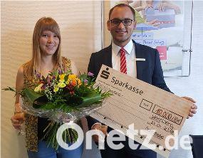 Kundenberater David Raab hatte in die Sparkasse Wernberg eingeladen und überreichte neben einem Blumenstrauß einen symbolischen Scheck. Maria Schwandner hat schon einige Ideen, wie sie den überraschenden Geldsegen investieren wird. Der Los-Einsatz von lediglich einem Euro pro Los hat sich gelohnt.