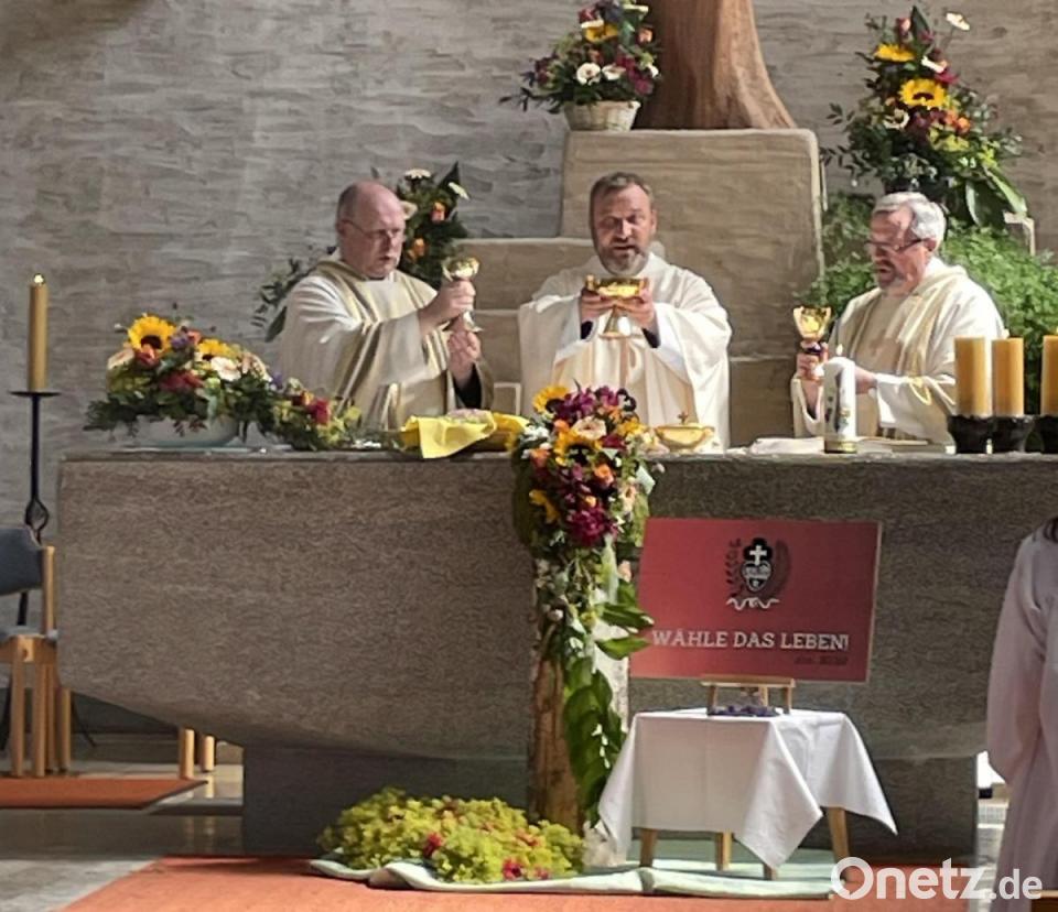 In einer Gabenprozession brachten die Pfarrgemeinderats- und Ortsgremiensprecherinnen Blumen, Brot und Weintrauben, eine Kerze sowie Kelch und Hostienschale mit Texten hinterlegt zum Altar.