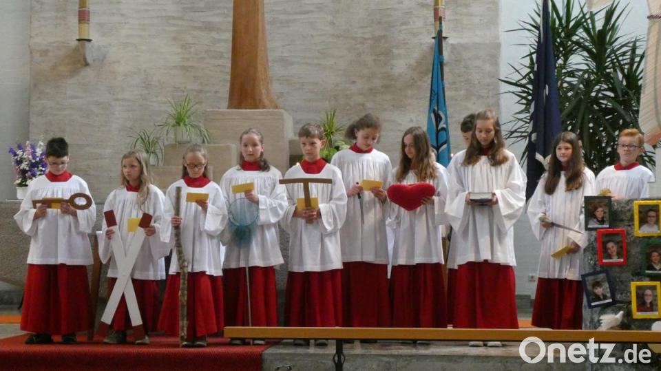 Nach dem Evangelium, in dem es um die Berufung der zwölf Jünger ging, stellten zwölf Ministranten die verschiedenen Attribute und Beigaben der zwölf Apostel vor. Sie beendeten jeweils ihren Text mit dem Satz: Der Glaube hat mein Leben hell gemacht. Mesner Josef Behringer jeweils eine Kerze am Apostelleuchter an. Alfred Kick wies darauf hin, dass die Apostelleuchter daran erinnern, "dass wir das Licht des Glaubens von Christus über die Apostel empfangen haben und berufen sind, dieses Licht auch in die Welt hinaus zu tragen. Zum "Vater unser" lud Pfarrer Demleitner die anwesenden Kinder und Jugendlichen ein, zum Altar zu kommen, gemeinsam das "Vater unser" zu singen und danach den Friedensgruß vom Altar aus an die anwesenden Gläubigen weiterzugeben. Die musikalische Gestaltung des Gottesdienstes übernahmen Organist Christian Dorner sowie Georg und Maria Manner. Sie verstanden es mit ihrer Musik, die Herzen der Gläubigen zu berühren.