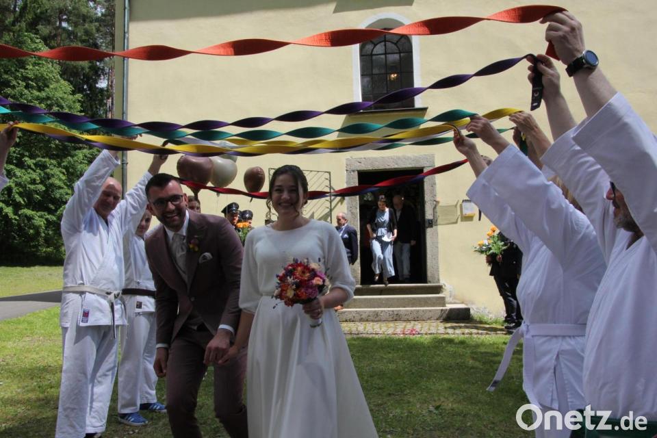 Nach der Trauung erwartete ein großes Ehrenspalier das Brautpaar. Mit dabei waren die Feuerwehr Wernersreuth, Arbeitskollegen der Braut und eine starke Abordnung der Karate-Dojo-Sparte des SV Altenstadt. Die Braut trägt den "Braunen Gürtel". Auch die Blaskapelle Falkenberg war vertreten und spielte dem Brautpaar einige Stücke vor, darunter den "Gruß aus Böhmen". Die Braut ist aktive Trompeterin in der Blaskapelle.