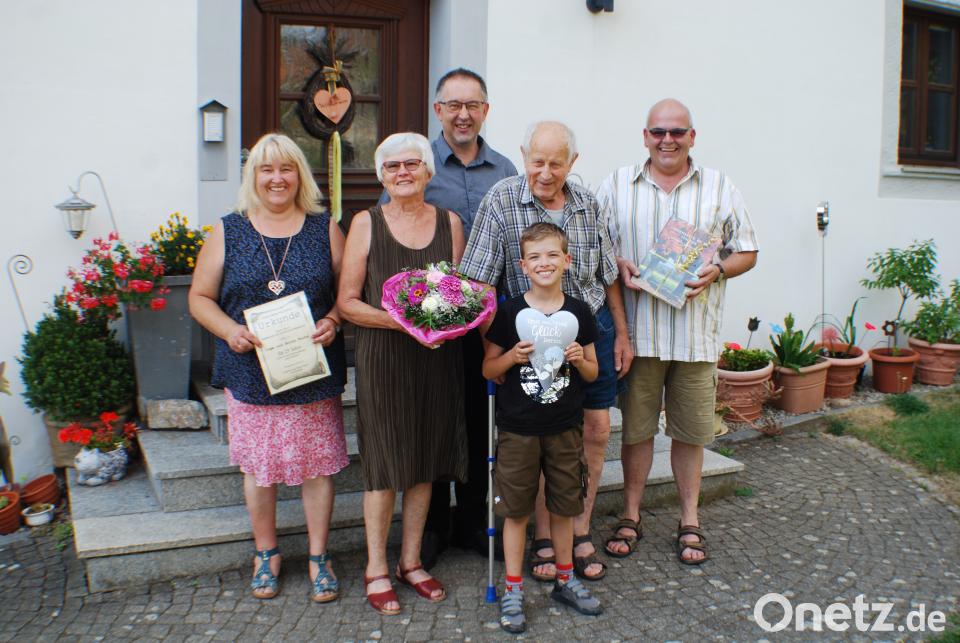 (enz) Sie sind also gleichzeitig mit der Familie hier „eingezogen“, wie Gastgeber Bürgermeister Klaus Meyer scherzend bemerkte. Dafür erhielten sie von ihm und seiner Frau eine Urkunde und ein Präsent als Dank und Erinnerung an viele gemeinsame Erlebnisse. Ehepaar Fuchs kommt jährlich anlässlich des Heimattreffens der Plan-Weseritzer zum St. Anna-Tag und bleiben immer eine Woche. Da konnte der Vorsitzende des Fremdenverkehrsvereins, Alfons Schnurrer, sich im Namen des Vereins für 25 Jahre „Heimkommen“ bedanken, denn schließlich spreche man die gleiche Sprache. Dass solche Stammgäste die „Goldstücke“ der Vermieter seien, liegt seiner Meinung nach auf der Hand. Er überreichte als kleines Dankeschön ein „Überlebenspaket“ aus der Gäste-Information mit dem Alwareither Stamperl und der beliebten hausgerührten Marmelade sowie einen Blumenstrauß.