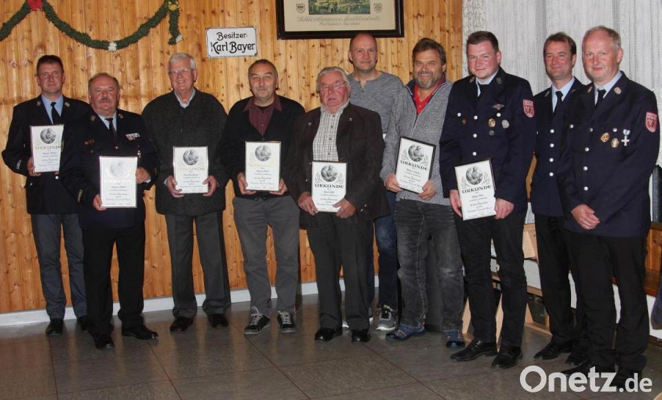 Für 50 Jahre im aktiven Dienst wurde Andreas Wührl geehrt. Seit 40 Jahren bei der aktiven Truppe ist Klaus Riedl, für 25-jährigen aktiven Dienst wurde Thorsten Meiler ausgezeichnet. Seit 20 Jahren sind Holger Blohmann, Helmut Gleißner, Michael Köhler, Roland Scherm und Ralf Steinberger bei der aktiven Truppe, seit 10 Jahren sind Stefan Beer, Florian Greil, Michael Meierhöfer, Andreas Puß und Marcel Schultes aktiv. Über eine besondere Auszeichnung durfte sich Christian Blohmann freuen: Für seine Verdienste wurde dem langjährigen Zweiten und jetzt amtierenden Ersten Kommandanten das Ehrenkreuz des Freistaates Bayern in Silber verliehen.