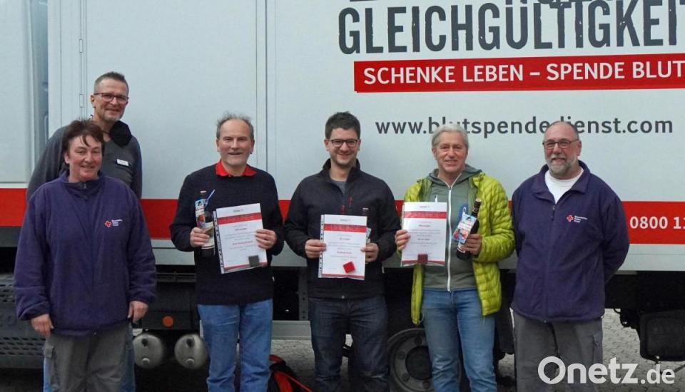 Karl-Georg Haubelt spendete bereits 150 Mal Blut. „Ich versuche regelmäßig zu gehen, falls es passt auch sechs Mal im Jahr, seit das erlaubt ist“, sagte der Wiesauer. Dafür nimmt er auch längere Fahrten in die umliegenden Orte und Städte in Kauf. Armin Eger, ebenfalls aus Wiesau, ließ sich inzwischen schon 100 Mal Blut abzapfen und der Fuchsmühler Andreas Konz brachte es auf 25 Spenden. „Bleiben Sie uns treu“, sagte Freund, was die drei auch versprachen. Was die Spender besonders hervorheben, ist die seit kurzem bestehende Möglichkeit, sich im Internet zu einer bestimmten Uhrzeit für die Spende anzumelden. Dadurch gebe es so gut wie keine Wartezeiten. Cornelia Klarner, Leitung sozialer Dienst, und Richard Meierl, stellvertretender Bereitschaftsleiter, beide vom BRK Wiesau, überreichten Urkunden, Anstecknadeln und Geschenke an die langjährigen Spender.
