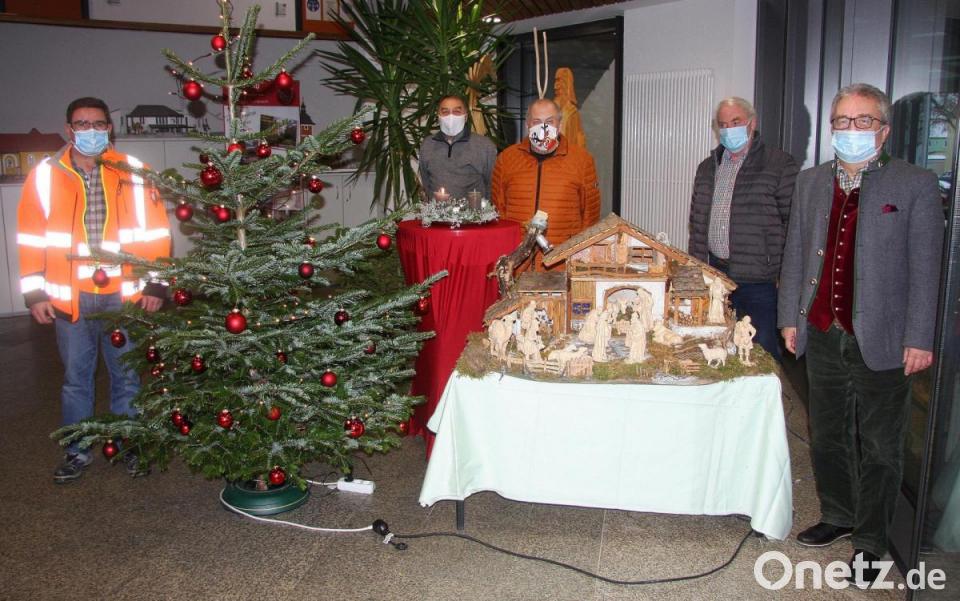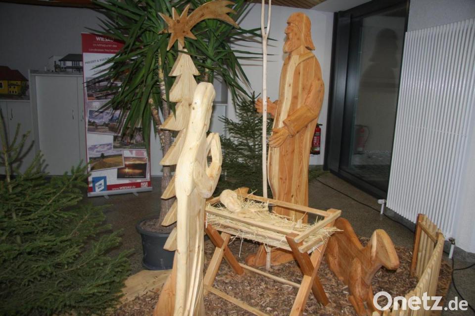 Im vorweihnachtlichen Schmuck präsentiert sich derzeit auch das Foyer des Wiesauer Rathauses. Im Eingangsbereich stehen ein kleiner Christbaum, ein Adventskranz und eine Krippe mit lebensgroßen Figuren. Die dort ausgestellte Szene mit Maria, Josef und dem Jesuskind stammt aus der Werkstätte der Wiesauer Schnitzergruppe, die sich regelmäßig in einem Raum des Schulhauses trifft, um dort zu arbeiten. Gefertigt wurde die lebensgroße Krippe bereits im vorigen Jahr. Eigentlich war geplant, sie mit weiteren Figuren zu ergänzen. „Wir mussten uns aber den Corona-Schutzauflagen beugen. Daher waren uns die Hände gebunden“, bedauerten die Vertreter der Schnitzergruppe, Karl-Heinz Meier und Manfred Dietz, die ausgefallenen Arbeitsstunden, um das Werk fortzusetzen. Das Künstler-Duo versicherte aber, dass man das Ziel, die lebensgroße Krippe weiter zu ergänzen, im Auge behalte.