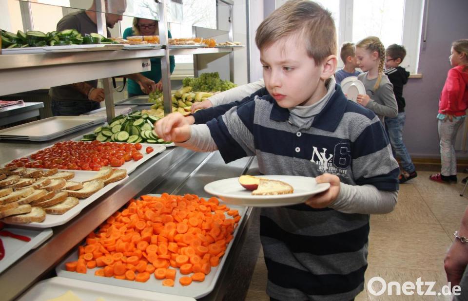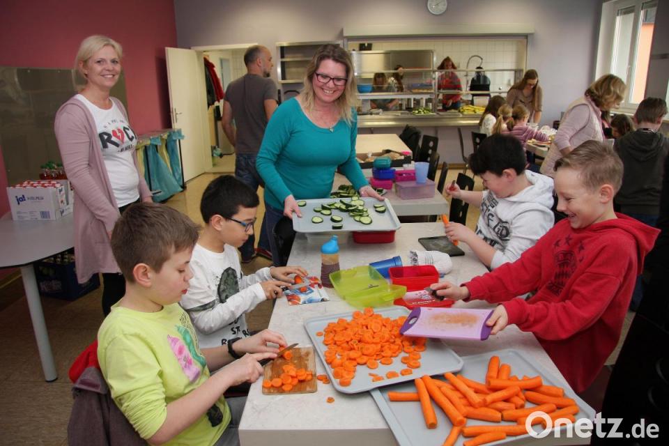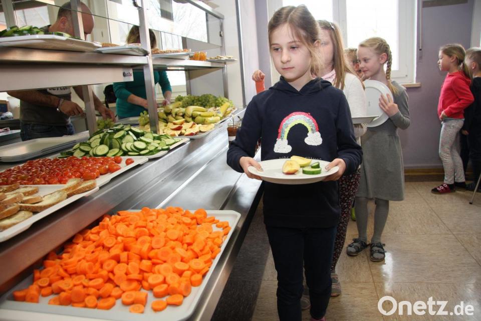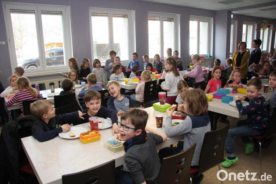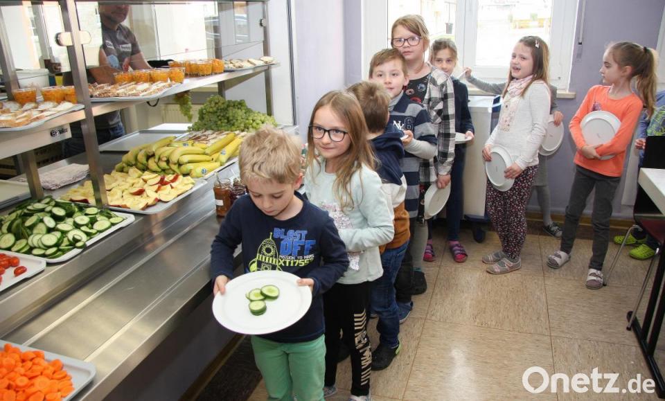 Küche statt Schulzimmer, Messer und Schneidbretter anstatt Stifte und Hefte: Regelmäßig seit vielen Jahren treffen sich die Grundschüler einmal im Jahr zum Zubereiten und anschließendem Frühstücken in der Mensa. Der Elternbeirat unterstützt sie bei den Arbeiten und hat schon mal alles vorbereitet. Begleitet wird der Vormittag auch von zwei Mitarbeitern einer örtlichen Zahnarztpraxis, die den Milch- und Saftausschank übernommen haben. Bereits in aller Früh waren die Großen zum Einkaufen unterwegs. Eine Rechnung für das was sie in den Kartons heranschleppen, haben sie aber nicht mitgebracht. Alles was man dazu braucht, um ein buntes Frühstücksbuffet aufzubauen, hat nämlich ein Wiesauer Supermarkt gestiftet. Seit der ersten Schulstunde wird geschält und geschnippelt. Einige der Buben und Mädchen streichen die Brote, andere dekorieren Weintrauben, geschnittene Äpfel und Gemüsestreifen auf die vorbereiteten Platten. Ergänzt wird der Frühstückstisch durch Marmeladen in Schälchen, Müsli, Milch, Mineralwasser oder Säfte. Alles ist reichlich vorhanden es fehlt an nichts.