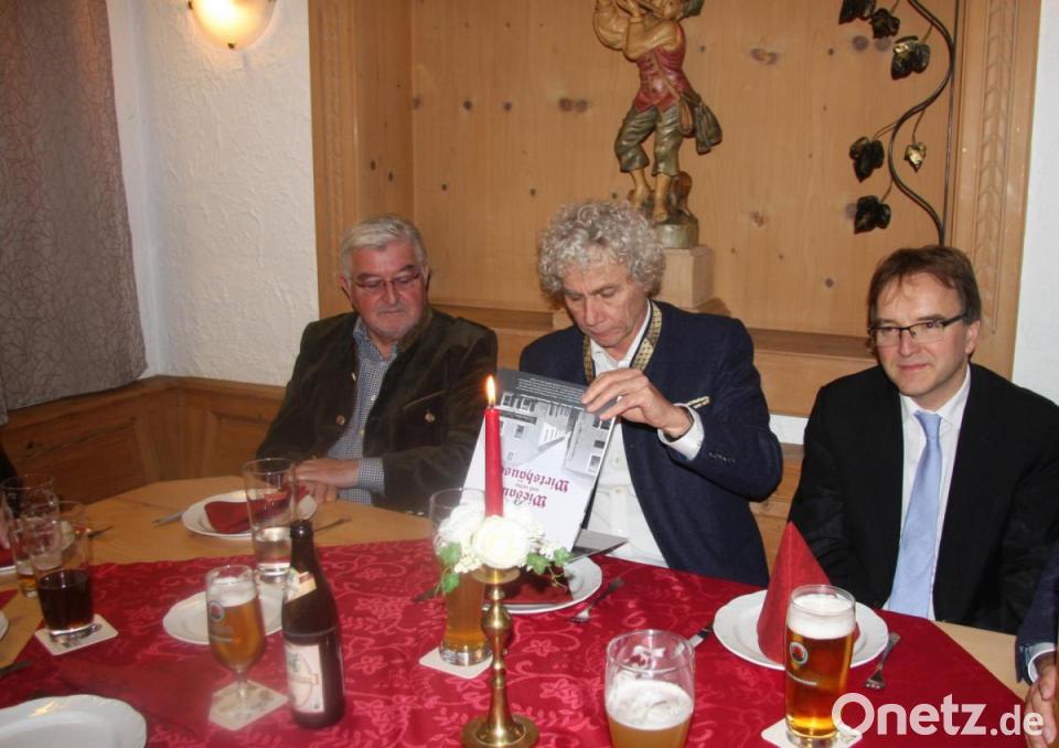 "Die Karpfen, die heute auf die Tische kommen, stammen aus dem Kornthaner Teichbetrieb Stock", informierte Bürgermeister Toni Dutz im Restaurant „Deutsches Haus“. Mit dem aktuellen Heimatkalender „Wiesau und seine Wirtshäuser“ bedankte sich der Gastgeber bei Regierungspräsident Axel Bartelt, Regierungsvizepräsident Christoph Reichert und Landrat Wolfgang Lippert fürs Kommen, die sich wiederum mit der „Falkenberger Zoiglmusik“ und einigen Flaschen Frankenwein für die Einladung nach Wiesau revanchierten.