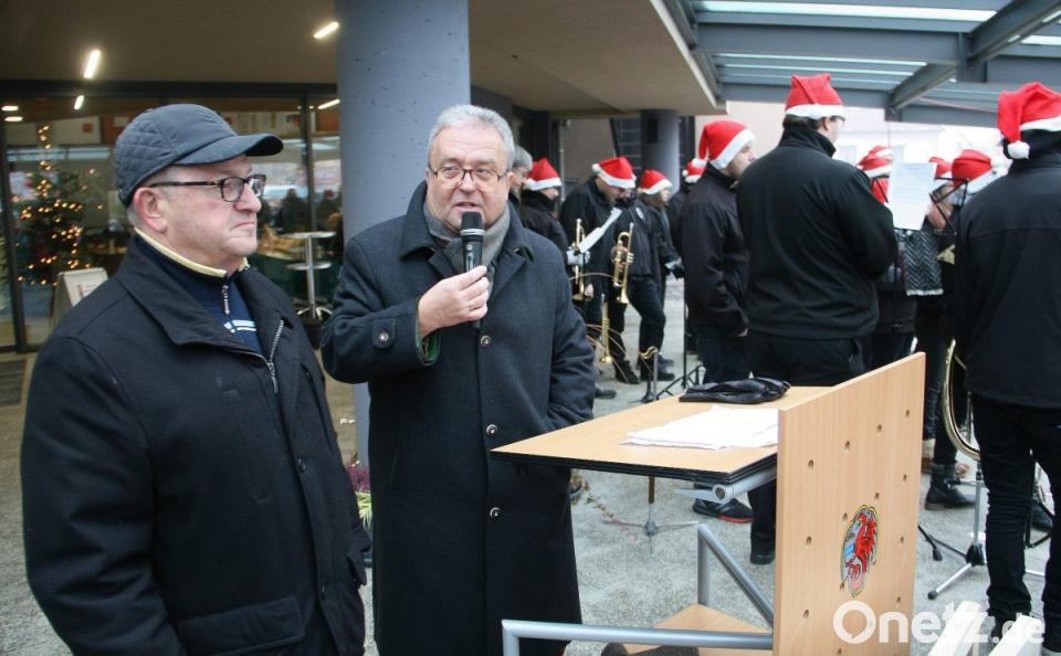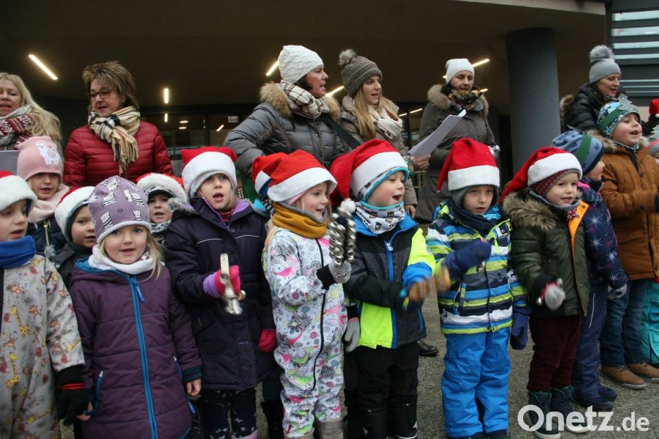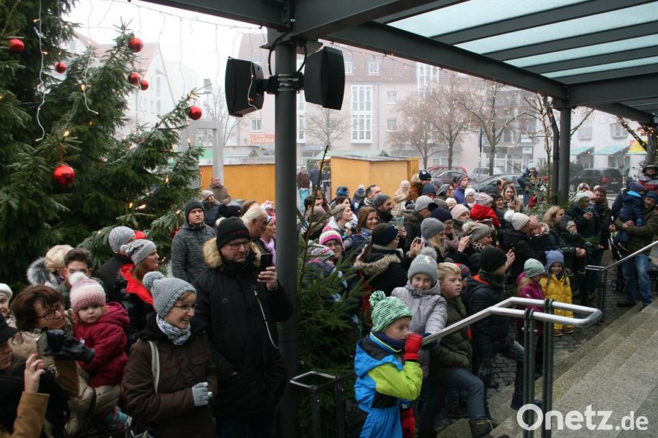 Im Gegensatz zu anderen Weihnachtsmärkten hat die Budenstadt nur einen Tag geöffnet. Der Auftakt war an der Rathaustreppe. Dabei begleitet wurden Bürgermeister Toni Dutz und zweiter Bürgermeister Fritz Holm von den Kinderstimmen aus dem Kindergarten St. Elisabeth, die Heiteres von der Advents- und bevorstehenden Weihnachtszeit zu berichten hatten.