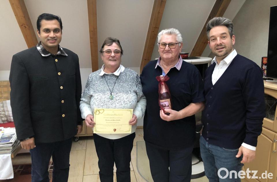 Geheiratet wurde in Wiesau, gefeiert beim „Völkl“, einer seinerzeit beliebten Gaststätte in Friedenfels. Kutschiert wurde das Ehepaar mit einem dunkelroten 200er Mercedes. Und, so erfuhr Oberpfalz-Medien auch, „wir hatten sogar Zeit für eine Hochzeitsreise, zum Onkel nach Hessen.“ Das Jubelpaar freute sich jetzt über die Glückwünsche, unter anderem vom zweiten Bürgermeister der Marktgemeinde Wiesau, Michael Dutz, und Pater James im Namen der Pfarrei.