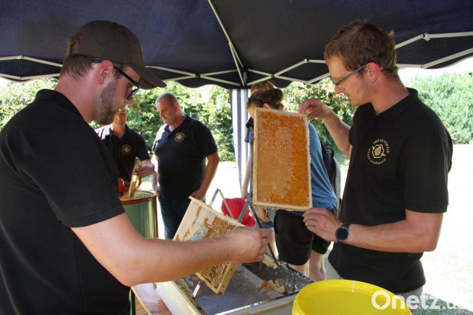 Sommerlich heiß war es an diesem besonderen Sonntag, an dem sich alles um die kleinen Sammler und den Honig drehte. Die hohen Temperaturen waren wohl der Grund, dass diesmal deutlich weniger Interessierte kamen als in den vergangenen Jahren. Diejenigen, die da waren, erfuhren nicht nur viel Wissenswertes, sondern durften auch einiges selbst ausprobieren. So konnte man eine Kurbel bedienen, um frischen Honig zu schleudern. Kostproben waren natürlich erwünscht.