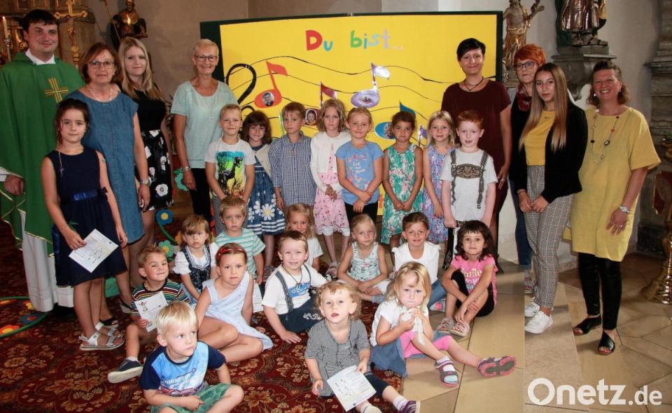 Pfarrer Maximilian Roeb kommt aus dem Abschiednehmen nicht heraus. Jetzt waren die Kinder von St. Josef an der Reihe. Begleitet wurden sie auch von einem „kleinen Ton C“ und seinen Freunden „G“ und „F“, die mit anderen Noten, die hinzueilen, zu einer Tonleiter wuchsen, um gemeinsam „Gottes Melodie“ zu komponieren. „Ganz aber schafften sie es nicht“, bedauerte Kindergartenleiterin Heike Kunte in der kindlichen Erzählung. „Man ging in die Schule“, was gleichzeitig ein Stichwort war, dass man auch von den Vorschulkindern Abschied nehmen musste, die der Seelsorger am Ende einzeln segnete.
