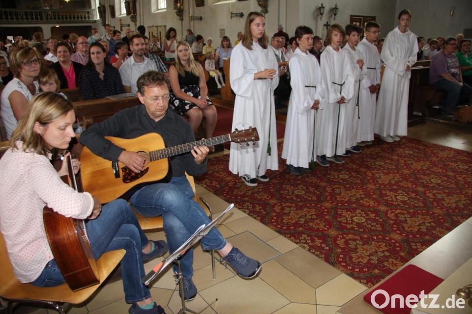 „Vergelt’s Gott“ stand auf einem bunten Teppich aus Mais- und Getreidekörnern. Die Fürbitten wurden von den Kindern vorgetragen, die dabei ihre Instrumente vorstellten. Gemeinsam im Kreis wurde das „Vater unser“ gebetet. Daniela Brunhofer und Klemens Reif begleiteten den kindgerechten Gottesdienst auf ihren Gitarren. Am Ende folgten Geschenke: Je eine „Tüte Urlaub“ erhielt der scheidende Elternbeirat. Ein „Wenn-Buch“, das alle Fragen des Alltags beantwortet, bekam der Pfarrer, der sich über die Tipps dankbar zeigte. „Herzliches Vergelt‘s Gott für die Arbeit und alles Gute“, schallte es ihm entgegen.