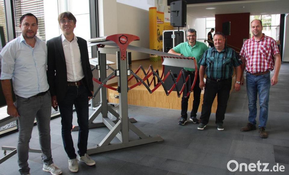 Verkäuflich sei das Ausstellungsstück, das zum Blickfang in der Berufsschulaula wurde, freilich nicht, verweist Thomas Diertl auf den Modell-Charakter der außergewöhnlichen Sonnenschutzanlage, die am BSZ entwickelt wurde. Der Fachlehrer gab den Anstoß für die Projektarbeit, die den Arbeitstitel "Doppelseitige Scherenarmmarkise auf einer Wellenlänge" trägt.