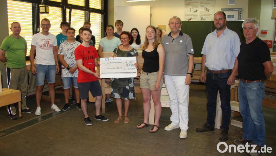 "Lichtblicke"-Schirmherrin Edith Lippert nahm die Geldspende wie schon in den Vorjahren persönlich an der Schule entgegen. Schon seit einigen Jahren ist der Lehrplan der angehenden Schreiner am Ausbildungszentrum bzw. im Berufsgrundschuljahr Holztechnik nach Lernfeldern gegliedert. Dürfen die Schüler zu Beginn jedes Schuljahrs noch einfache Werkstücke fertigen, ergänzt zunehmend die Verwendung von ausgewählten Holzwerkstoffen und anderen Materialien den Unterricht. Deren Ziel ist es, später den Gesellen- oder sogar den Meisterbrief in Händen zu halten.