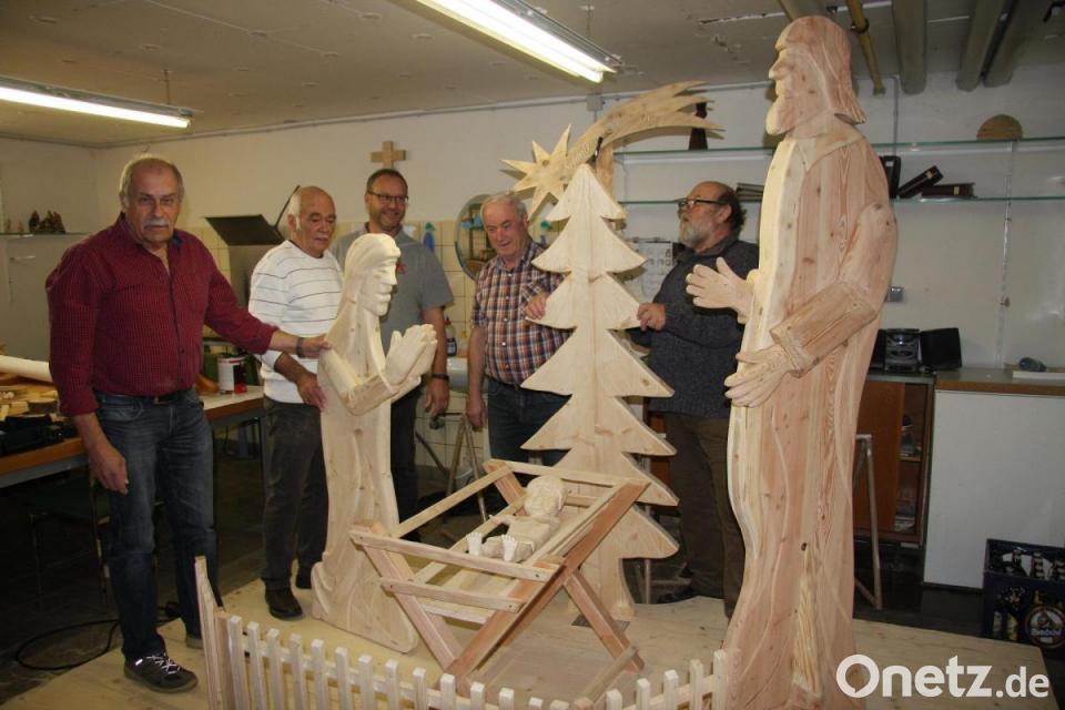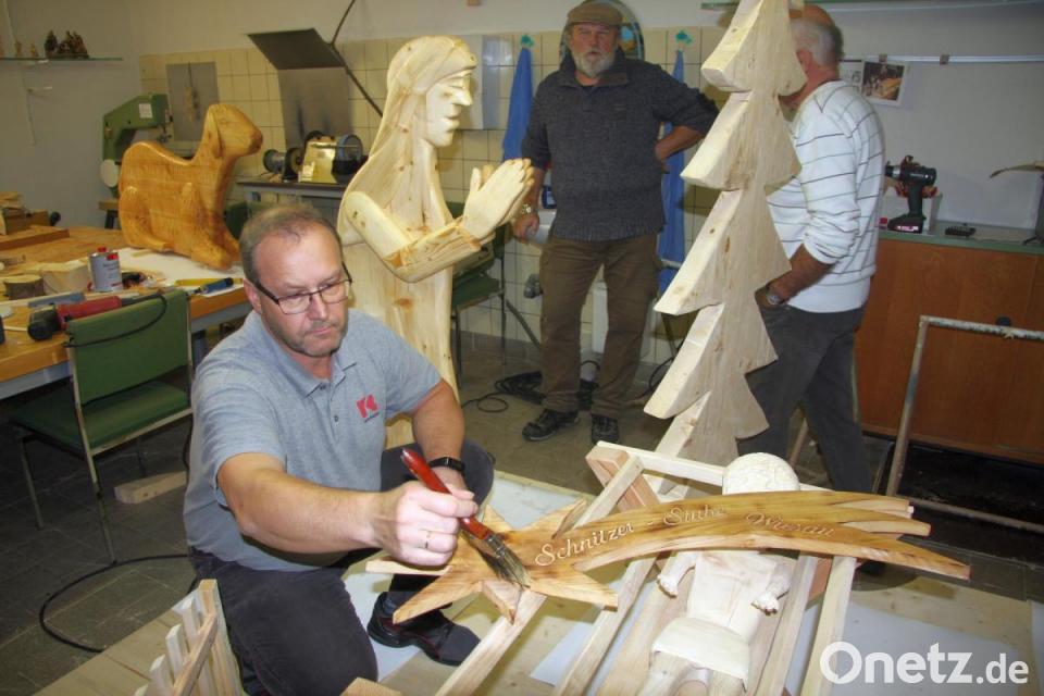 Bürgermeister Toni Dutz sicherte seine Unterstützung zu. Das benötigte Holz wurde vom Bauhof zur Verfügung gestellt. Was sonst noch an Material gebraucht wurde, kauften sich die Schnitzer selber. Im Frühsommer stieg man in die Planungsphase ein, um die übergroße Wiesauer Weihnachtskrippe umzusetzen. "Es lag auf der Hand, dass wir mit der Heiligen Familie, also mit Maria, Josef und Jesus, beginnen werden", informiert Meier im Gespräch mit Oberpfalz-Medien. Bald waren es mehr als "nur" drei Figuren. Meier deutet auf einen Holzstern mit der Aufschrift "Schnitzerstube Wiesau", zudem auf Schaf, Zaun und Tannenbaum, die das Ensemble abrunden.