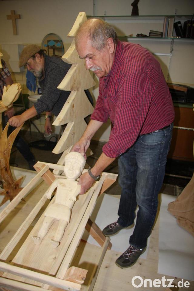 Den Grund für die vorverlegte "staade Zeit" erfährt man von Karl-Heinz Meier, der noch rasch prüfend ein hölzernes Lamm in Augenschein nimmt, um dann Hand anzulegen. Unterstützt wird er bei der umfangreichen Arbeit von Manfred Dietz, Karl-Heinz Ehrenfried, Harald Puss und Dieter Luksch. Zum handwerklichen Kreis gehört auch Siegfried Schuller, der sich an diesem Mittwoch aber eine Auszeit gönnt. An einer Werkbank bearbeitet Sigrid Pollinger, die die Arbeitsgruppe ergänzt, eine kleine Holzfigur, mit der sie ihre Hauskrippe ergänzen möchte. Die Falkenbergerin lässt sich - trotz des emsigen Treibens - nicht aus der Ruhe bringen. Manchmal helfen mehr, an anderen Tagen wieder weniger Hobbyschnitzer, um an einer besondere Sache Hand anzulegen.