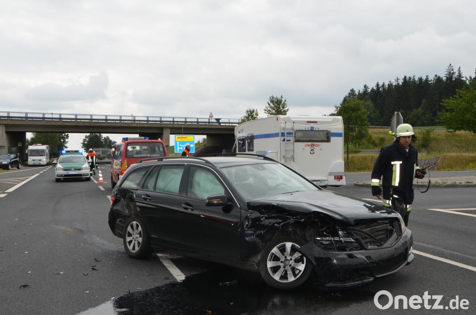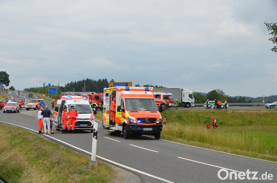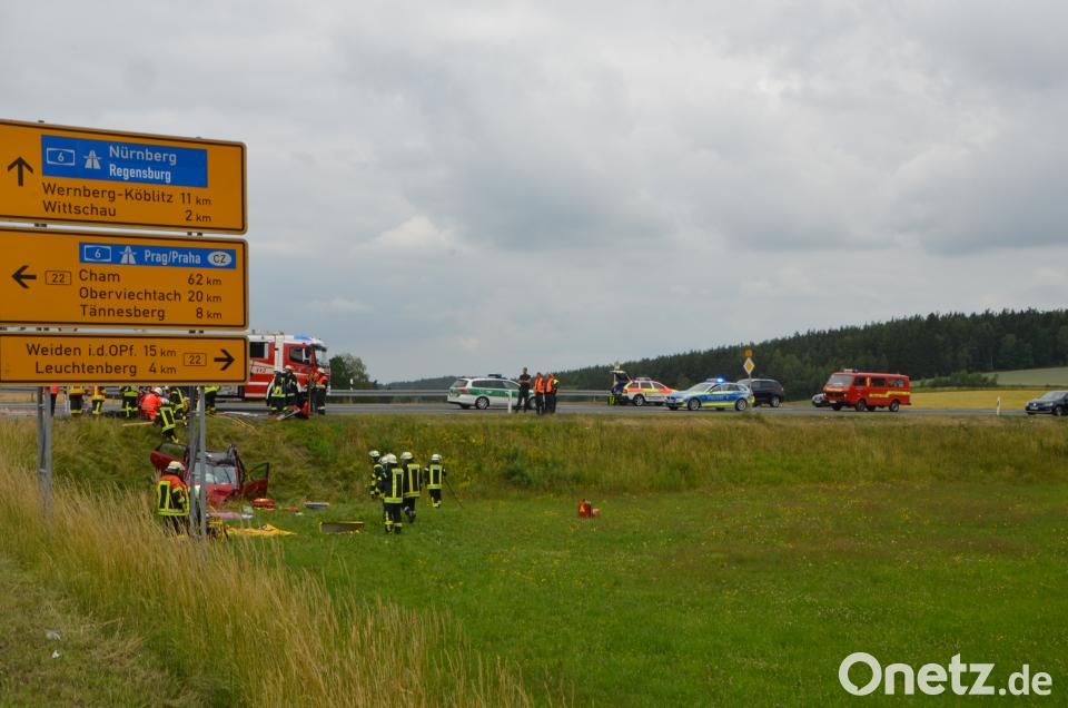 Durch die ungeheure Aufprallwucht kam der Toyota nach rechts von der Straße ab und blieb unterhalb einer steil abfallenden Böschung total demoliert liegen. Der Mercedes blieb nach dem Zusammenstoß mitten auf der B 22 stehen. Während sich der Fahrer aus seinem Toyota unter der Mithilfe von Ersthelfern selbst befreien konnte, wurde seine 69-jährige Ehefrau im Fahrzeug eingeklemmt und konnte erst durch die Feuerwehren aus Vohenstrauß und Oberköblitz unter Zuhilfenahme eines Rettungssatzes befreit werden. Der Rettungshubschrauber Christoph 80 flog die schwerverletzte Beifahrerin ins Klinikum Amberg, während ihr Ehemann und der Mercedesfahrer ins Klinikum nach Weiden eingeliefert wurden. Ein Helfer vor Ort (HvO) war zufällig in der Nähe und eilte sogleich an die Unfallstelle. Drei Notärzte kümmerten sich anschließend um die drei Verletzten. Mehrere Zollbeamte die zufällig als erste mit an der Unfallstelle waren, sicherten mit ihren Streifenfahrzeugen umgehend die Unfallstelle ab.