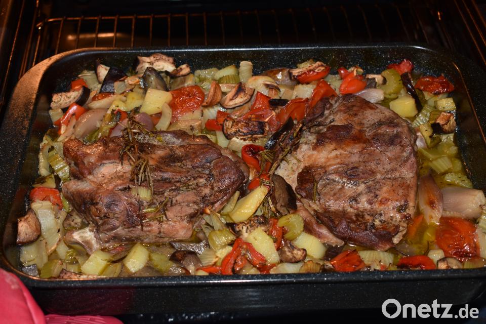 Gemüse putzen und waschen. In grobe Würfel schneiden. Sie Schalotten schälen und halbieren. Knoblauchzehen ebenfalls schälen und halbieren. Die Tomaten enthäuten und vierteln. Die Kartoffeln schälen und ebenfalls in grobe Würfel schneiden. Das Gemüse in eine feuerfeste Form geben. Die Frischlings-Schaufeln obenauf legen. Gemüsebrühe und Weißwein zugeben und zugedeckt 60 Minuten schmoren lassen. Die Temperatur auf 160 Grad verringern und nochmals 40 bis 60 Minuten schmoren lassen. (nd)