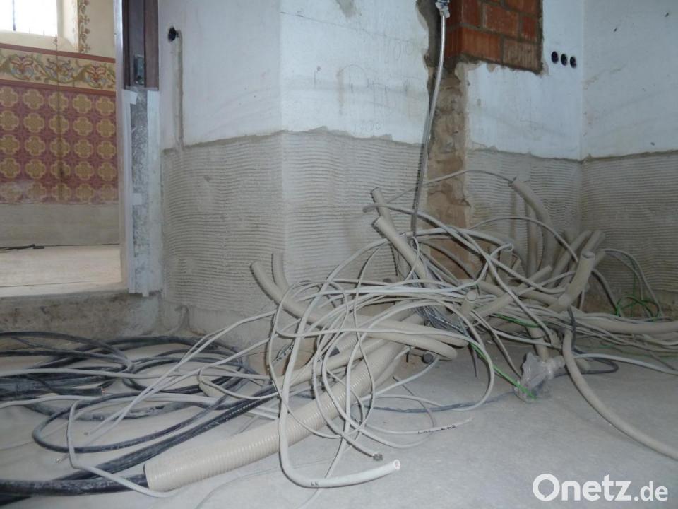 Der Blick fällt auf die vielen Kabelstränge, die sich am Boden und den Wänden kringeln. Denn die Firma Elektro Hägler aus Pfreimd ist dabei, die gesamte Elektroinstallation zu erneuern. Mittlerweile sind die großen Baumaschinen wieder abgezogen. Im Laufe der Woche stellte die Zimmerei Hanauer ein schmales Gerüst im Außenbereich auf und öffnete einen kleinen Teil des Daches für notwendige Arbeiten.