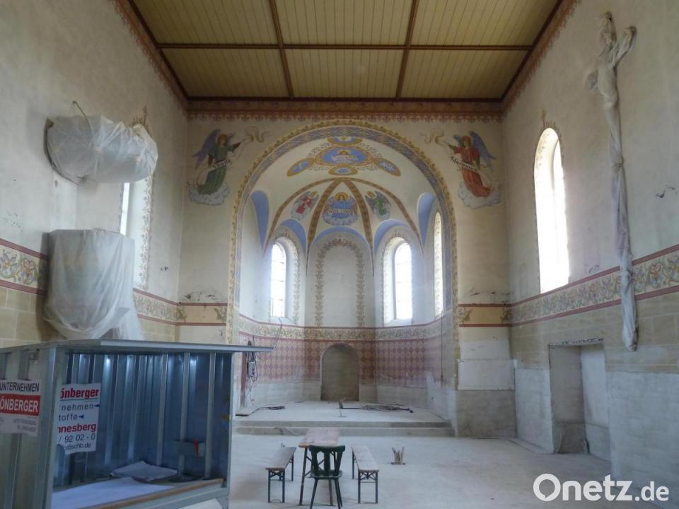 Als nächstes kommen die Kirchenmaler zum Einsatz, die mit der Trockenreinigung der kompletten Bemalung und dem Ergänzen der Quader im Sockelbereich sicher längere Zeit beschäftigt sein werden. Auch die Holzdecke wird gesäubert. Während der ursprünglich für den Verbleib eingepackte Hochaltar nun doch renoviert werden muss, gibt es einen neuen Volksaltar. Der Ambo zieht auf die andere Seite um und die Mesnerbank bleibt draußen.