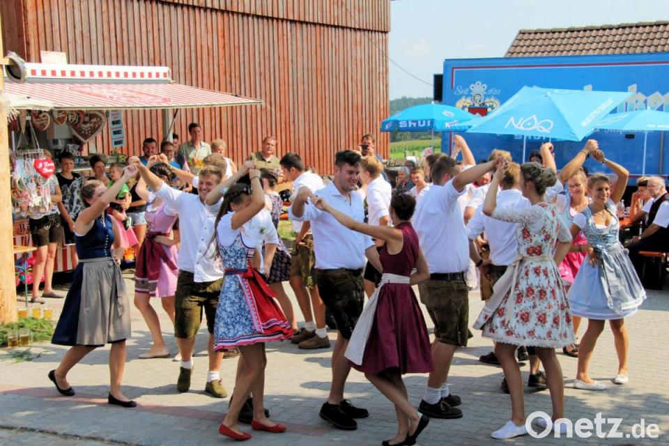 Es wurde den Gästen auch ein reichhaltiges Küchenbüfett im Gemeinschaftshaus angeboten, neben Getränken und Grillspezialitäten. Es war ein Kommen und Gehen, das sich bis in die Abendstunden hinzog. Gegen 14.30 Uhr bildeten die Kirwapaare mit der Musik "Oon'er geyt o" einen Kreis um den Baum. Unter lautem Klatschen der Besucher wurden die Sternpolka, Boarischer oder Fensterl aufgeführt. Langanhaltender Applaus war der Dank.