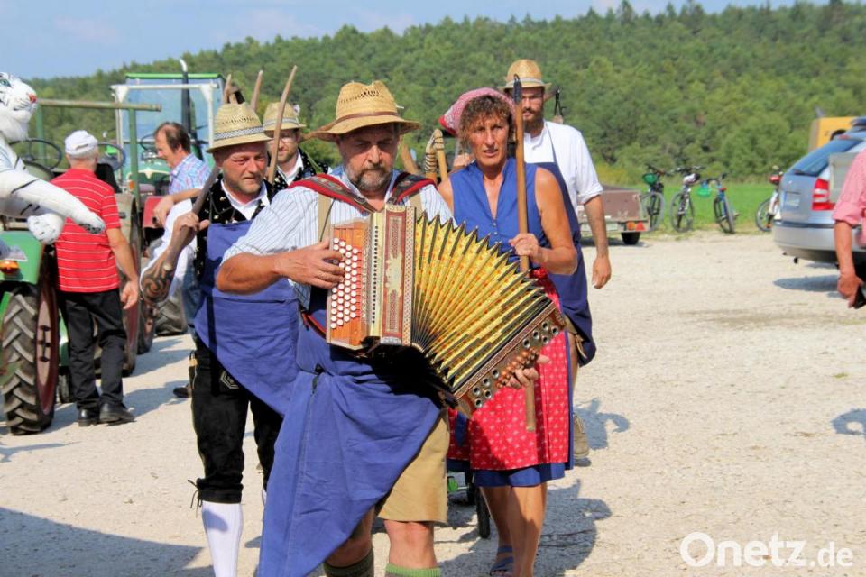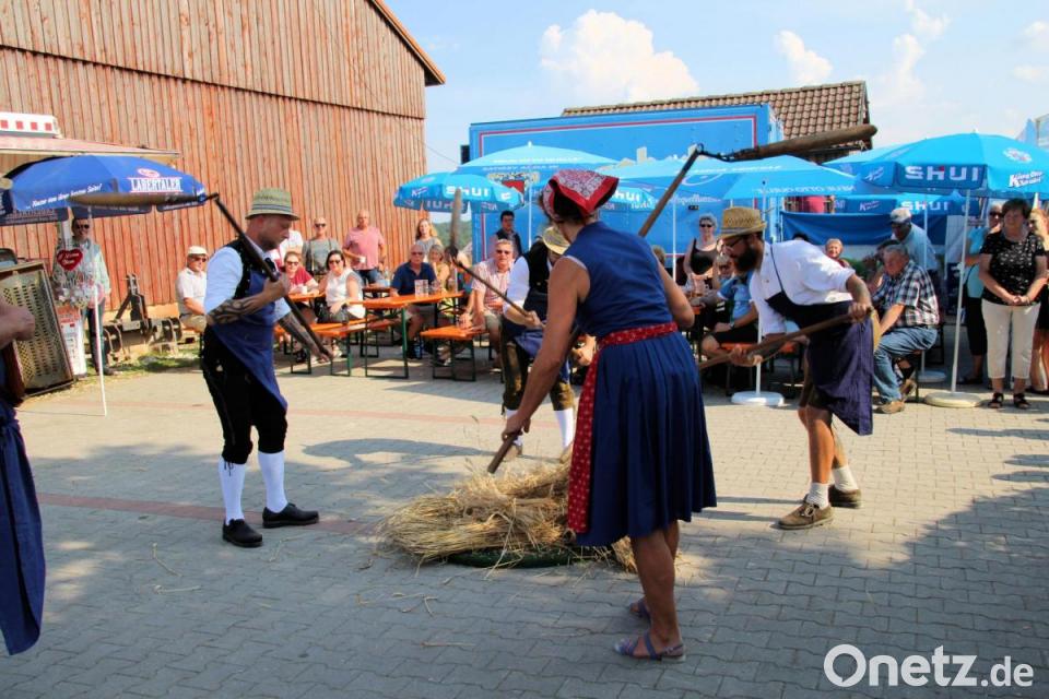Eine weitere Attraktion wartete auf die zahlreichen Gäste, als gegen 16 Uhr der Verein Drischldrescher aus Schmidmühlen unter Musikbegleitung einzog. Dabei wurde das Drischldreschen gezeigt. Viele erinnerten sich dabei an alte Zeiten und klatschten Beifall.