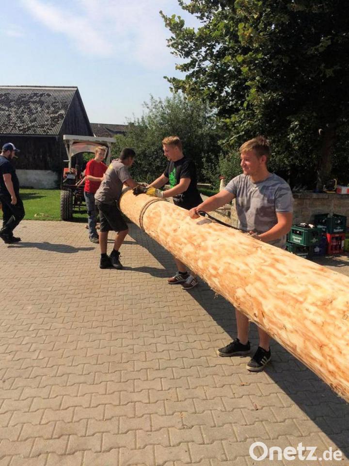 Nachdem der Stamm am Nachmittag durch einen Kran der Firma Fischer in der Senkrechten war, wurden mit Muskelkraft Stützpfähle mit einem Schlegel eingeschlagen, um den Baum zu sichern. Für die nötige Stärkung sorgten die Moidln mit Freibier für die freiwilligen Helfer. Ab 19 Uhr hieß es Unterhaltungsmusik mit "Saba z' dreckat".