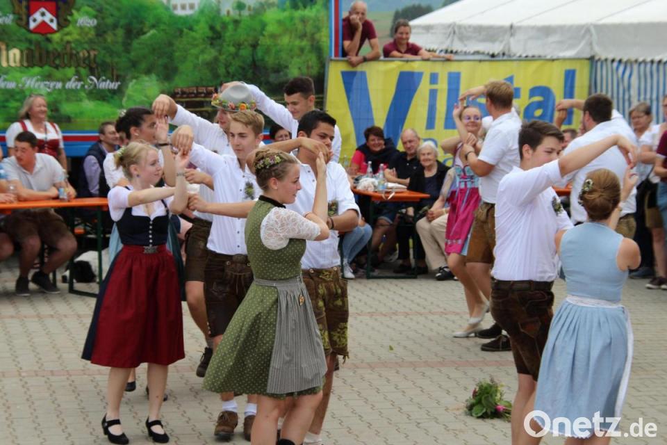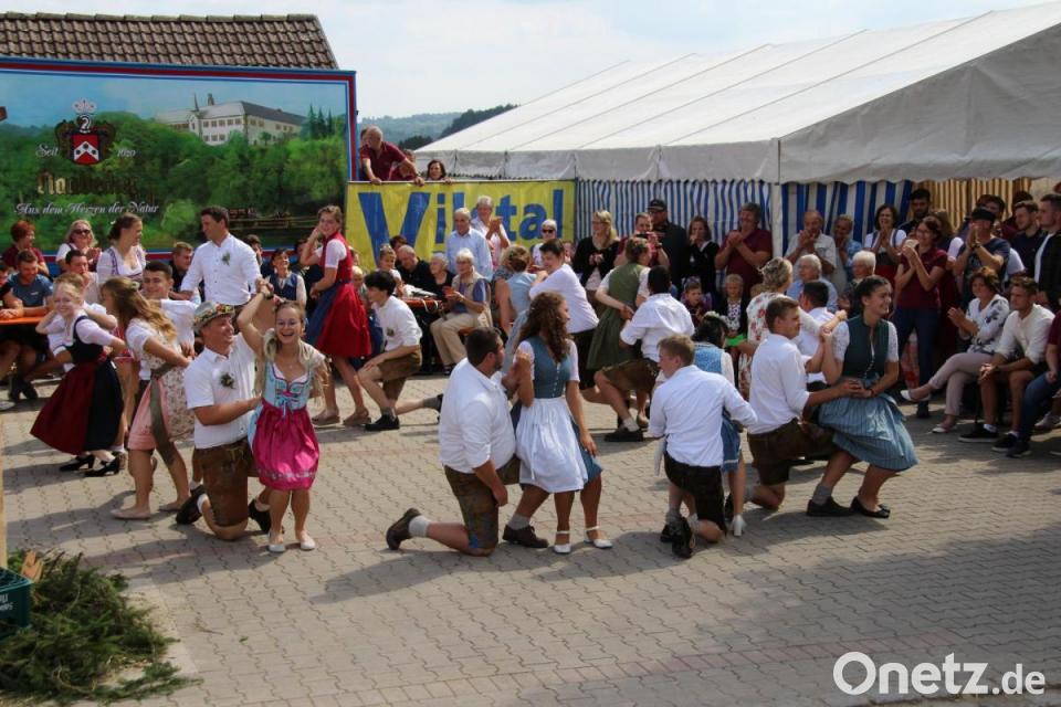 Gegen 14.30 Uhr zogen die Kirwapaare ein und zeigten unter lautem Klatschen der Besucher ihre Tänze wie Sternpolka, Boarischer oder Fensterl. Das neue Oberkirwapaar wurde bei einem Walzer ermittelt. Als die Musik verstummte, hatten Louis Weigert und Christina Wiesner den Blumenstrauß in Händen. Der neue Oberkirwabursch musste dann vom Kirwabaum den Kirwahut und das Schultertuch herunter holen. Natürlich war auch ein Ehrenwalzer fällig. Als weitere Attraktion wurde unter Musikbegleitung das „Drischldreschen“ gezeigt. Neben dem Dorfgemeinschaftshau war eine kleine Oldtimerschau aufgebaut.