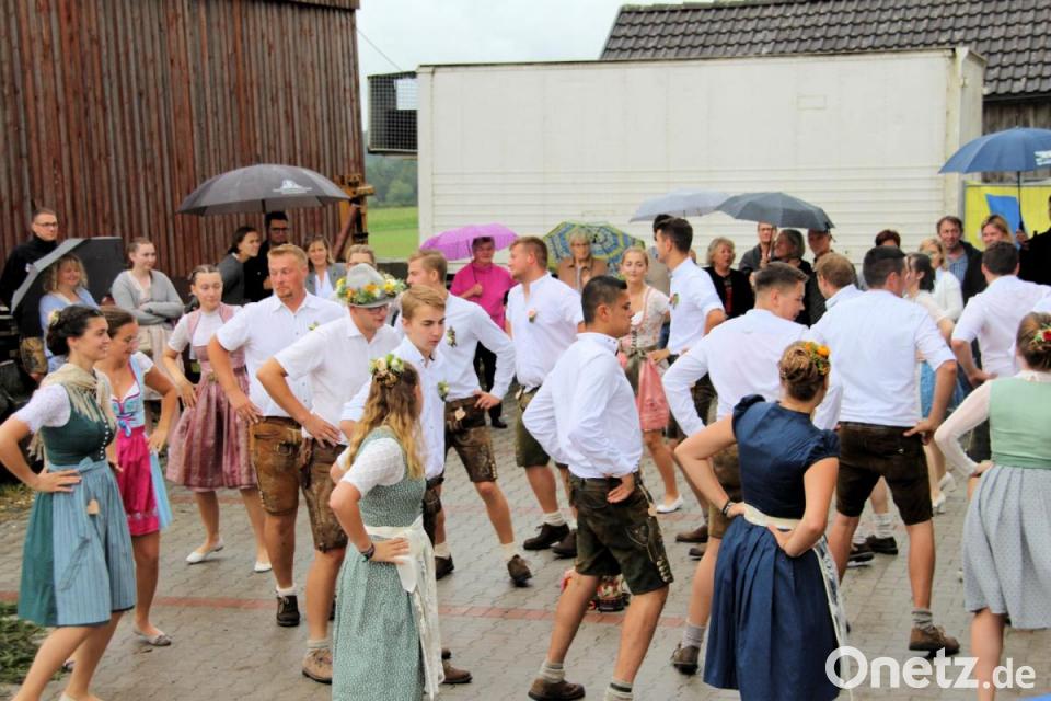 Trotz leichten Regens war die Kirwa auch am Sonntag sehr gut besucht. Ab dem Frühschoppen herrschte reges Treiben neben dem Dorfgemeinschaftshaus. Vorausgegangen war ein Gottesdienst in der Filialkirche, den Pfarrer Werner Sulzer zelebrierte. Die Moidln und Boum trugen Lesung und Fürbitten vor. Nach der Messe hatten die Helfer der Dorfvereine alle Hände voll zu tun, denn es herrschte beim Mittagessen reger Betrieb am Dorfgemeinschaftshaus, obwohl es regnete. Für die Kirwamusik sorgten dabei Bose und Fonse. Auf die Besucher wartete neben Getränken und Gegrilltem auch ein reichhaltiges Küchenbuffet.
