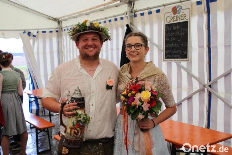 Gegen 14.30 Uhr zogen die Kirwapaare ein. Kaum war die Sternpolka getanzt, begann es stark zu regnen. Unter lautem Klatschen der Besucher folgten ein Boarischer und der „Siebenschritt“. Unter ihren Regenschirmen warteten die Zuschauer gespannt, wer denn nun das neue Oberkirwapaar bildet. Als plötzlich die Musik verstummte, hatten Timo Respondek und Anika Brogl den Blumenstrauß in Händen. Der neue Oberkirwabursch musste traditionell vom Kirwabaum den Kirwahut und das Schultertuch herunter holen. Natürlich musste das neue Oberkirwapaar auch einen Ehrenwalzer tanzen. Nach dem Austanzen bei starkem Regen waren die Moidln und Burschen bis auf die Haut patschnass.