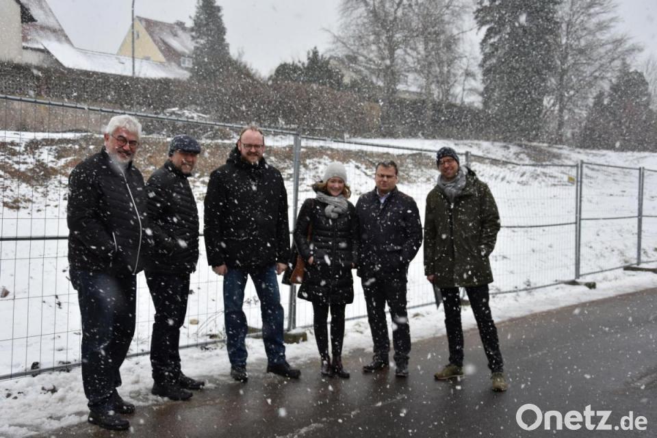 Bei dichtem Schneegestöber trafen sich die drei Vorsitzenden des Landkreissiedungswerks Simon Wittmann, Andreas Meier und Rupert Troppmann mit Bürgermeister Karlheinz Budnik sowie den Architekten Katrin und Axel Weidner in der Xaver-Lindner-Straße zur Baustellenbesichtigung.