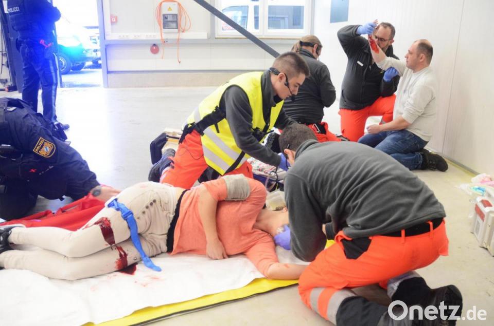 Nach den Reden, in denen der Wert der Zusammenarbeit und der Respekt vor Ehrenamtlichen im Fokus steht, gewähren Retter und Polizisten einen kurzen Blick in das Training. Die Einsatzkräfte simulieren eine blutige Beziehungstat - mit Maschinenpistolen und Mikrofonen. Der Einsatz wird von mehreren Kameras gefilmt und auf der große Leinwand gezeigt.
