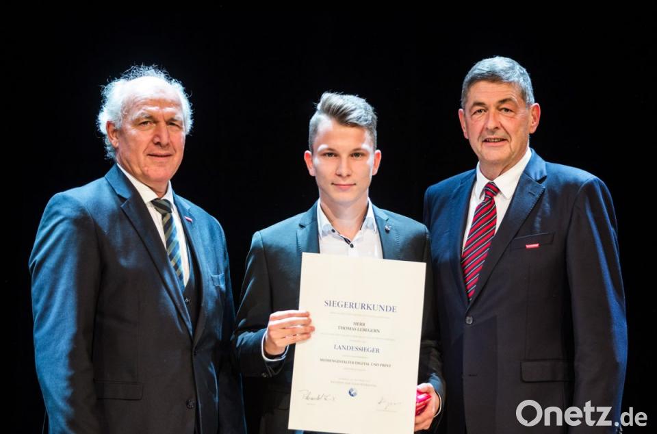 Thomas Lebegern aus Windischeschenbach ist neuer Landessieger im Ausbildungsberuf Mediengestalter Digital und Print im Leistungswettbewerb des Deutschen Handwerks 2018. In der Bamberger Kongreßhalle befand sind der junge Mann in guter Gesellschaft. Insgesamt gab es 106 Preisträger. Sie zählen nun zur jungen Elite des bayerischen Handwerks: Der Präsident des Bayerischen Handwerkstags, Franz Xaver Peteranderl, und der Präsidenten der Handwerkskammer Niederbayern-Oberpfalz, Georg Haber, überreichten Lebegern die Urkunde. Der Leistungswettbewerb des Deutschen Handwerks wird seit 1951 in rund 120 verschiedenen Berufen ausgetragen und gilt als eine Art "Olympiade der dualen Ausbildung im Handwerk".