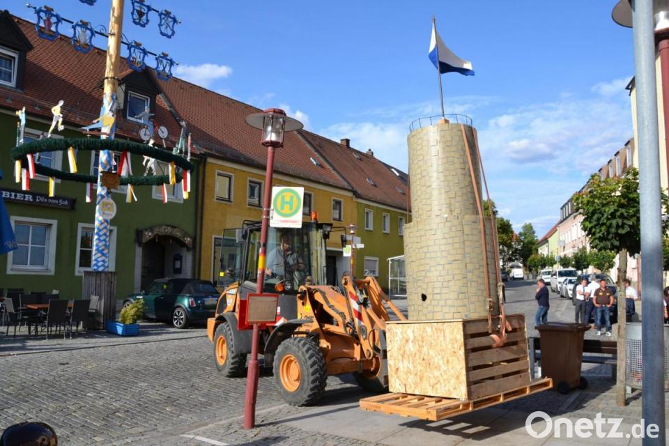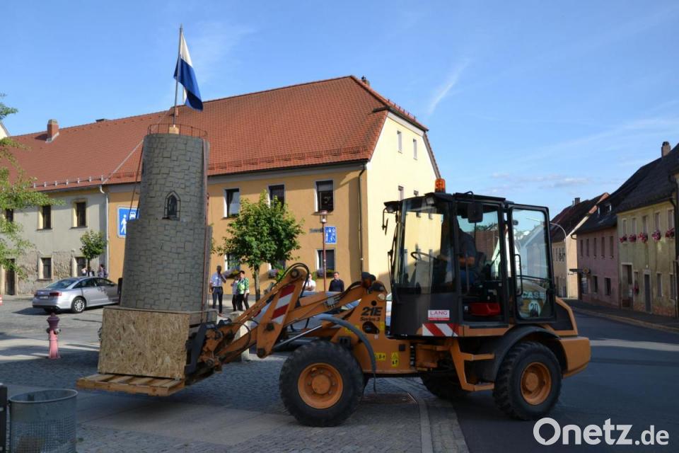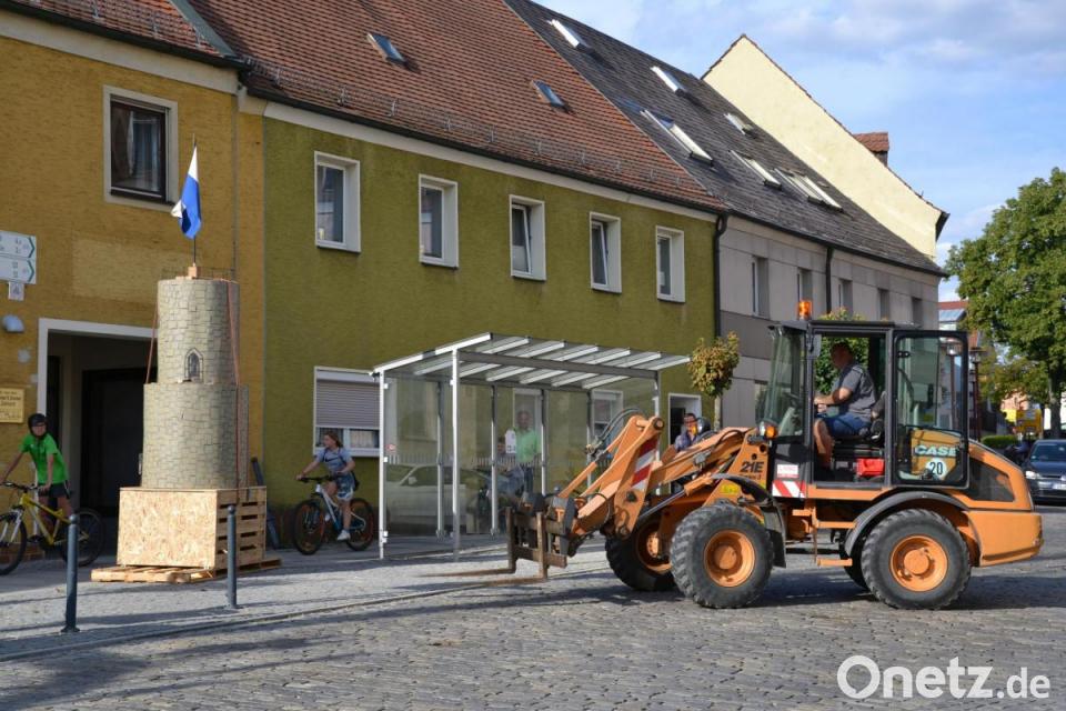 Die fünf Meter hohe Nachbildung des Neuhauser Butterfassturms sollte dem Stadtrat bei der endgültigen Standortsuche für die Zoiglskulptur helfen. Rein optisch haben der Turm und das Kunstwerk nichts gemein, aber die ungefähre Größe und die Ausmaße ähneln sich. Bauhofmitarbeiter Andreas Bogner hatte den Turm auf eine Palette montiert, um ihn so problemlos mit der Ladergabel zu erfassen und an den verschiedenen Stellen abzusetzen. Ausprobiert wurden der Platz vor dem früheren Blumenladen der Gärtnerei Hausner, die Ecke Stadtplatz/Erbendorfer Straße und die Freifläche vor dem Haus Nummer 9. Für diesen Platz hatte sich der Stadtrat in der vergangenen Sitzung eigentlich schon entschieden. Überlegungen des Architekturbüros Kuchenreuther, alle möglichen Standorte am Stadtplatz auszuloten, lagen der Aktion zugrunde. Begeisterungsstürme lösten die drei verschiedenen Plätze nicht aus. Die CSU blieb bei der Variante vor Haus Nummer 9, die Freien Wähler tendierten zu den beiden anderen Vorschlägen und die SPD bedauerte immer noch, dass der „Gockl“-Standort nicht zu realisieren ist. Bürgermeister Karlheinz Budnik gab die Meinung einiger Zoiglbrauer weiter, denen der Stadtplatz als Standort lieber sei, als der Stachus. Mit den Stimmen der CSU entschied sich das Gremium für den Stadtplatz 9. SPD und Freie Wähler lehnten dies ab. Einig waren sich alle, die Skulptur in einem Brunnen zu verwirklichen.