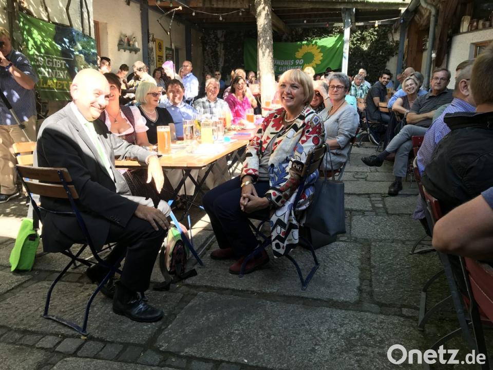 Im Hof der Zoigl-Wirtschaft "Beim Gloser" ist kein Platz mehr frei. Claudia Roth ist pünktlich. Launig präsentieren die beiden Bezirksvorsitzenden Tina Winklmann und MdB Stefan Schmidt die Kandidaten, die "alle gegen die Angstmacherei und gegen den rechten Populismus antreten". Die Kemnather Band "Soundgeflecht" spielt keine Blasmusik.
